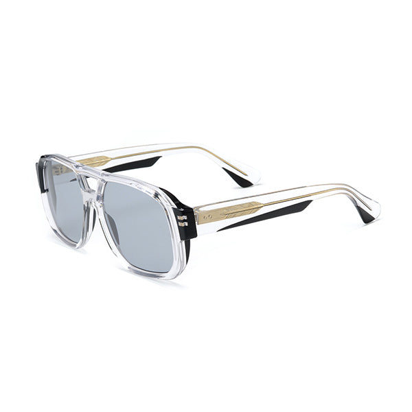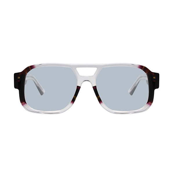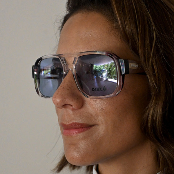 Lentes azules con una montura de color transparente y dorado, montura cuadrada de acetato y un detalle dorada en la parte interna de la varilla.