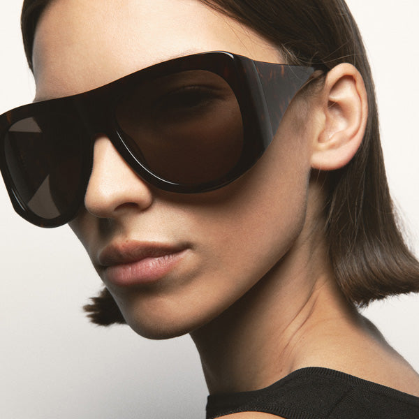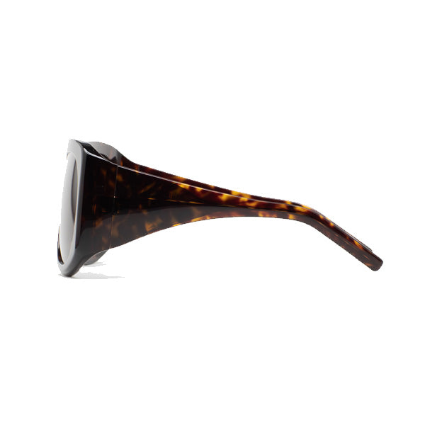 Gafa de sol aviador envolvente con lente tórica y talón curvado. Frontal y varillas de acetato havana marrón oscuro. Lente gris con 100% protección UV y tratamiento antirreflejante. Lente Categoría 3. Plaquetas de acetato incorporadas. Hecha a mano.