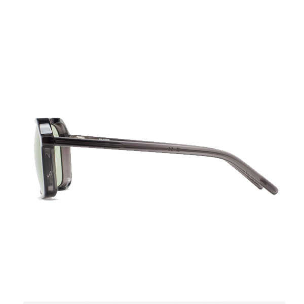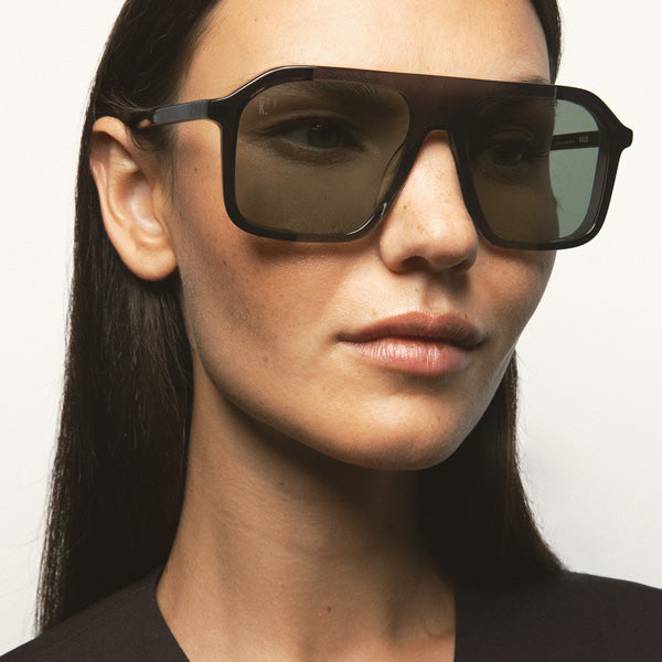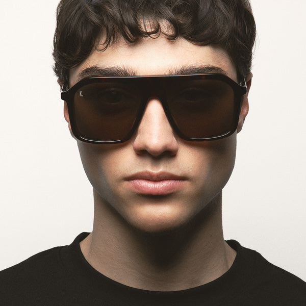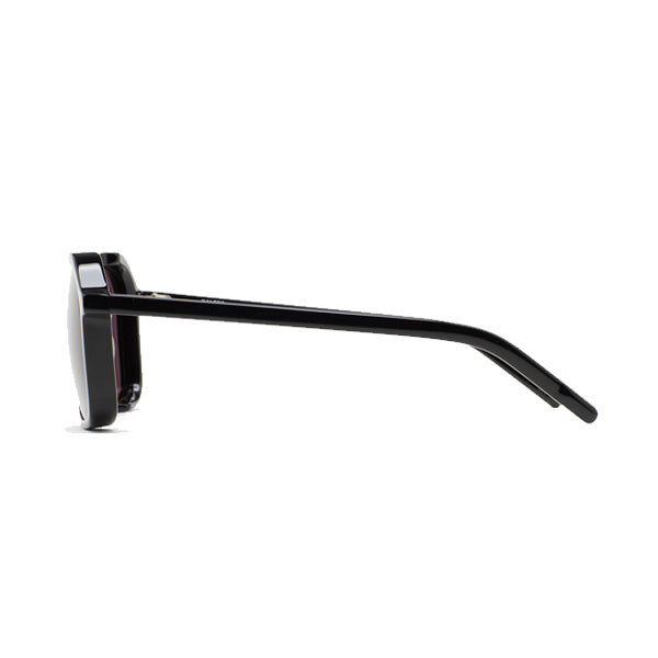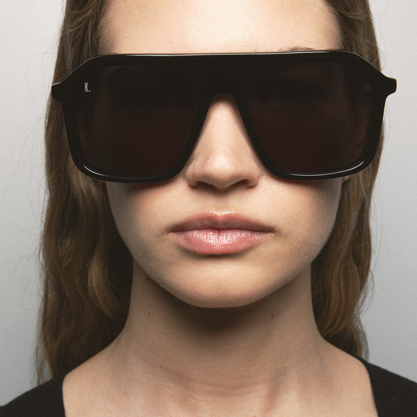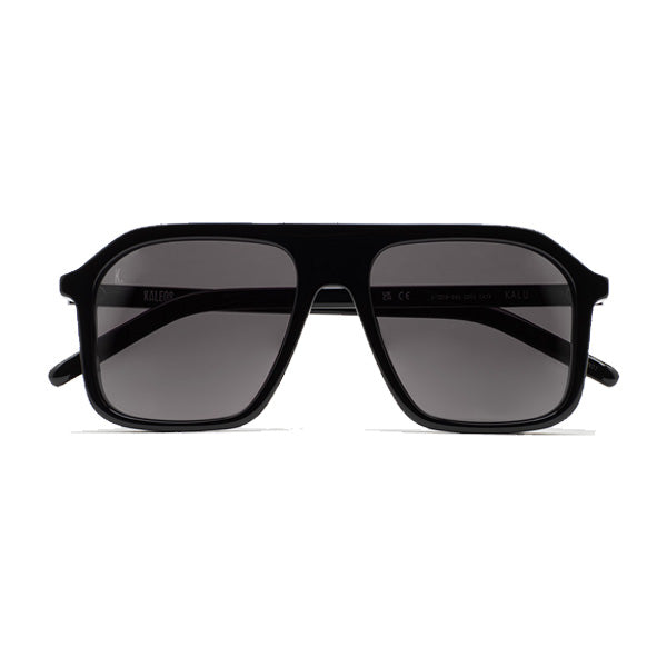 Gafa de sol cuadrada Kaleos con el puente plano con alerones en los lados. Frontal y varillas de acetato. Lente gris base 6 con 100% protección UV y tratamiento antirreflejante. Lente Categoría 4. Plaquetas de acetato incorporadas. Hecha a mano.