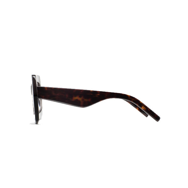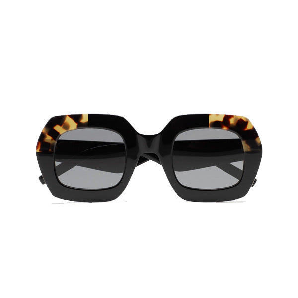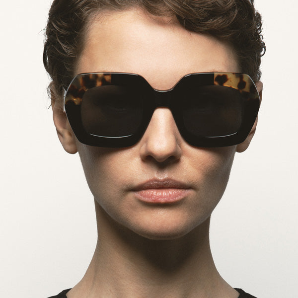 Gafa de sol de forma cuadrada Kaleos. Frontal de acetato con laminado havana marrón. Varillas de acetato negro. Lente gris base 2 con 100% protección UV y tratamiento antirreflejante. Lente Categoría 3. Plaquetas de acetato incorporadas. Hecha a mano.