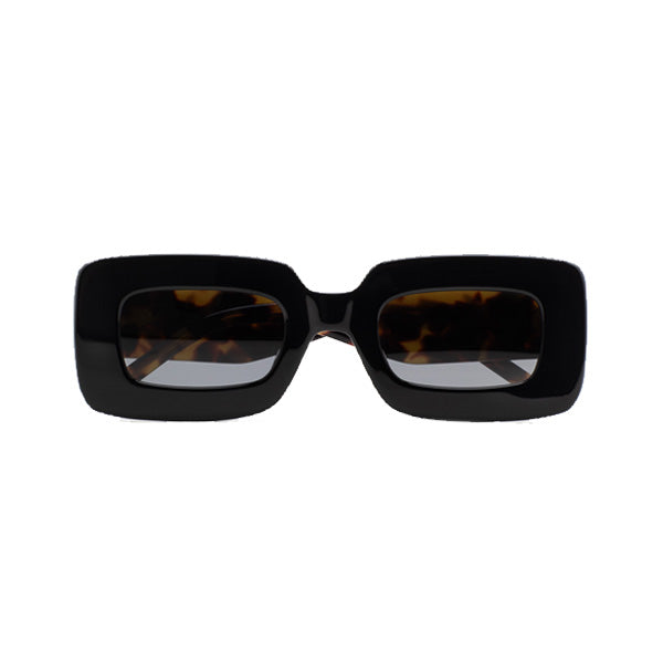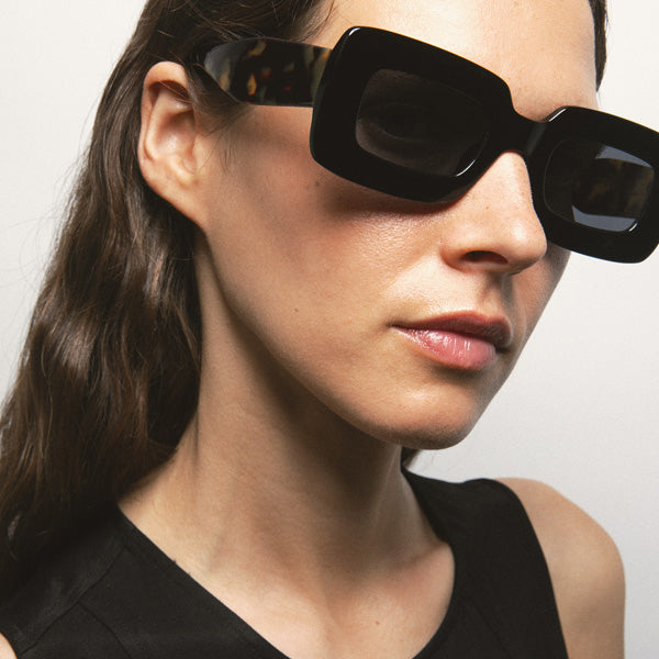 Gafa de sol de forma rectangular. Frontal de acetato negro y varillas de acetato. Lente base 2 con 100% protección UV y tratamiento antirreflejante. Lente Categoría 3. Plaquetas de acetato incorporadas. Hechas a mano.