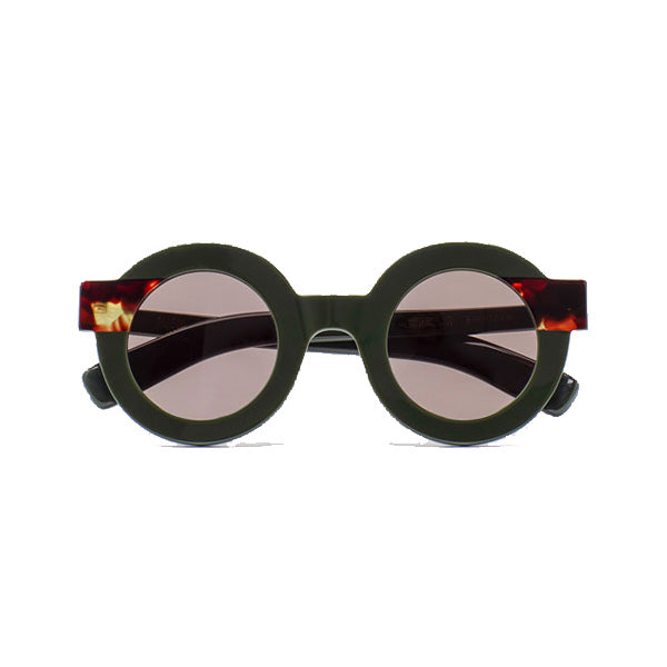 Gafa de sol de acetato verde bosque con laminado havana marrón oscuro. Forma redonda. Varillas de acetato. Lente base 2 gris degradada con 100% protección UV a nivel del acetato y con tratamiento antirreflejante. Lente Categoría 3. Plaquetas de acetato incorporadas. Hecha a mano.