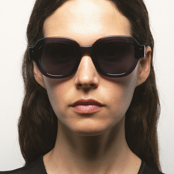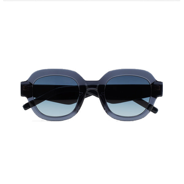 Gafa de sol de forma cuadrada. Frontal de acetato azul grisáceo transparente y varillas de acetato azul marino. Lente azul oscura degradada base 2 con 100% protección UV y tratamiento antirreflejante. Lente Categoría 3. Plaquetas de acetato incorporadas. Hecha a mano.