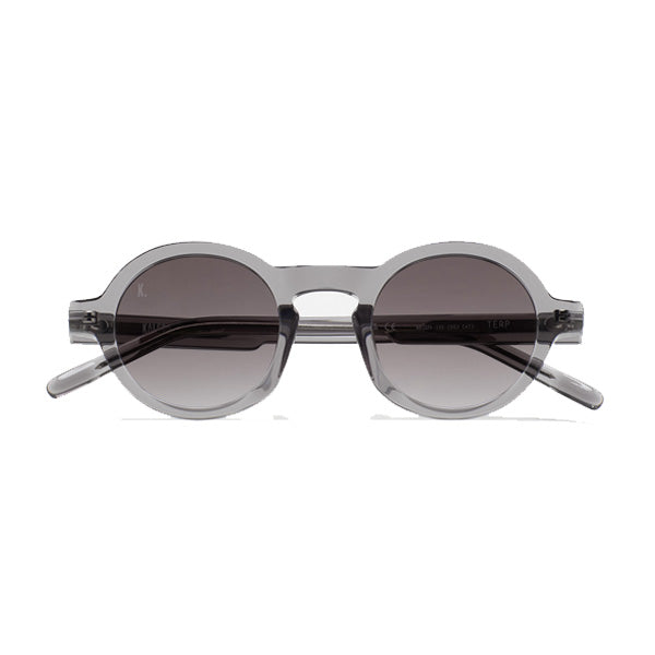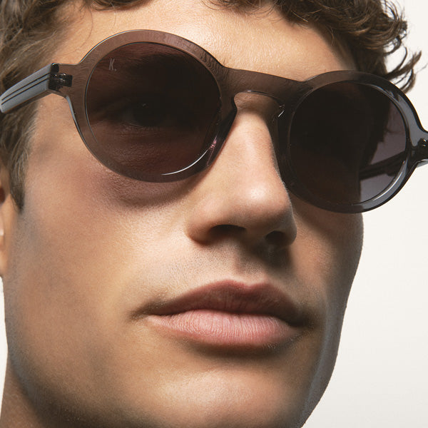 Gafa de sol de forma redonda Kaleos. Frontal y varillas de acetato gris transparente. Lente gris degradada base 2 con 100% protección UV y tratamiento antirreflejante. Lente Categoría 3. Plaquetas de acetato incorporadas. Hecha a mano.