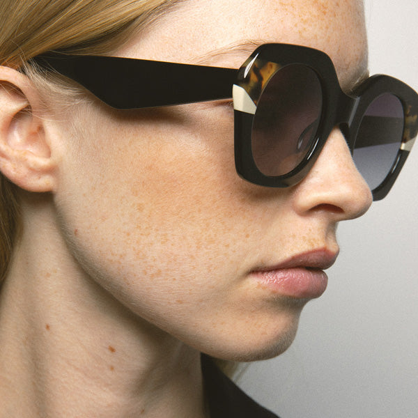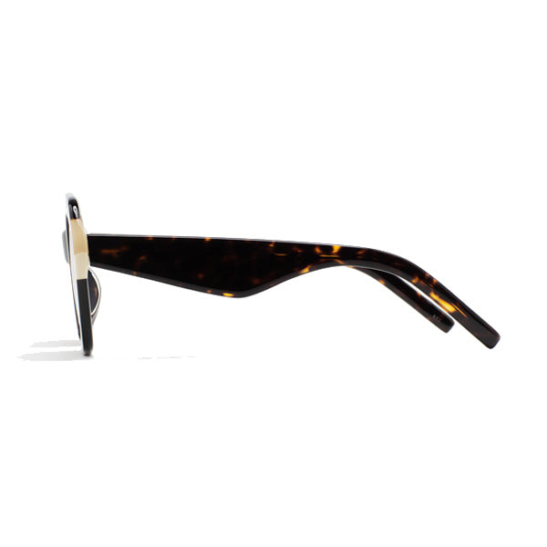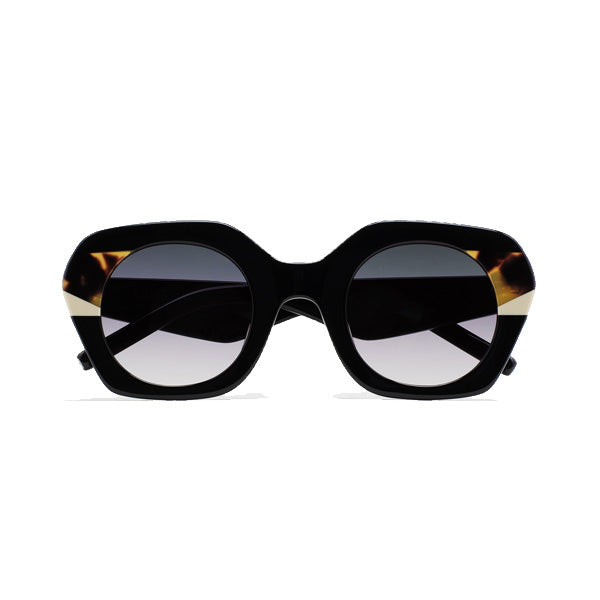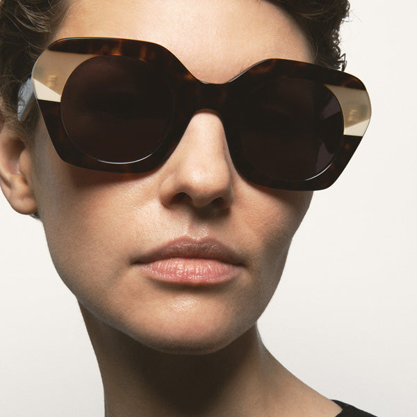 Gafa de sol de forma hexagonal Kaleos. Frontal de acetato con doble laminado. Varillas de acetato. Lente base 2 con 100% protección UV y tratamiento antirreflejante. Lente Categoría 4. Plaquetas de acetato incorporadas. Hecha a mano.