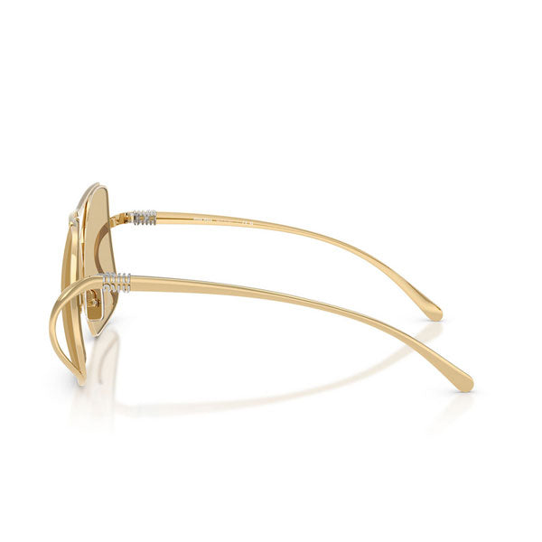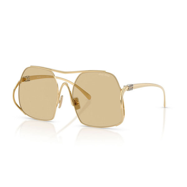 Modelo de gafas de sol metálica en dorado con una sofisticada forma. El logo Miu Miu vertical de las patillas adorna el accesorio con el elegante toque de la marca.