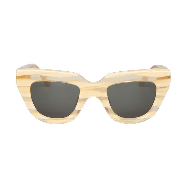 Modelo de gafas de sol de forma potente con un ligero toque ojo de gato que destaca por un mayor peso en la parte superior. Arriesgada y diferente. Acetato de celulosa con bisagras de metal de 5 dientes. Protección total UV400 con filtro de protección categoría 3.