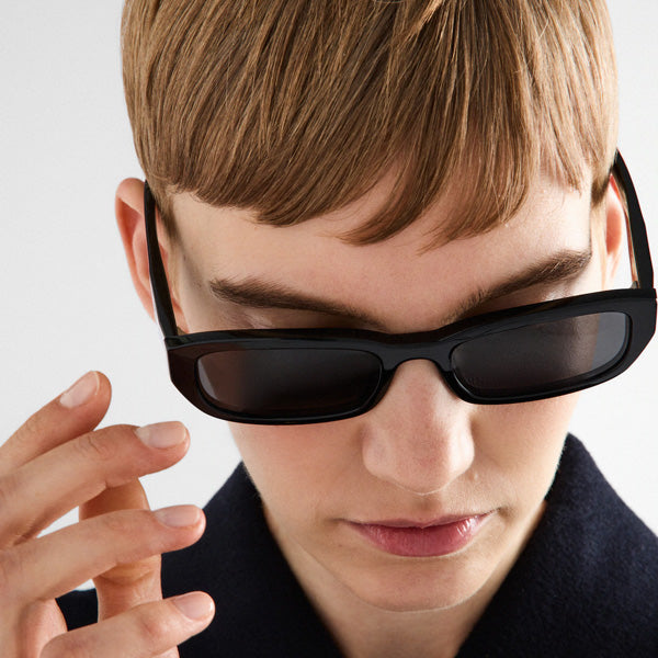 Gafas de sol PRADA 0PR B06S de acetato caracterizadas por los aros facetados y las líneas geométricas. Las patillas presentan una sofisticada elaboración artesanal tridimensional que destaca el icónico logo triangular.